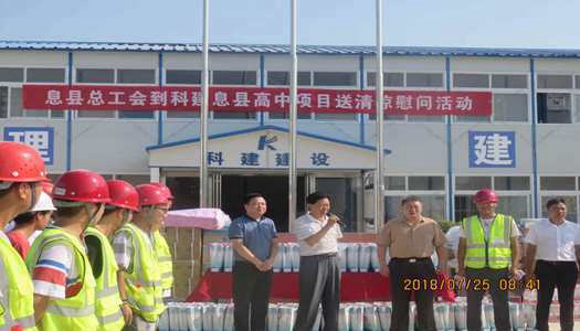 2018年07月25日8:30,息縣原副縣長吳昊、總工會主席戴清金,息縣城市建設投資有限公司息縣高中項目建設指揮部劉增書記等一行,頂著炎炎烈日前往息縣高中一期項目部慰問送清涼活動。息縣總工會為一線建筑工人送來了防暑降溫慰問品:雨傘、水杯、霍香正氣水、毛巾、香皂、礦泉水、牙刷及牙膏共800多套。